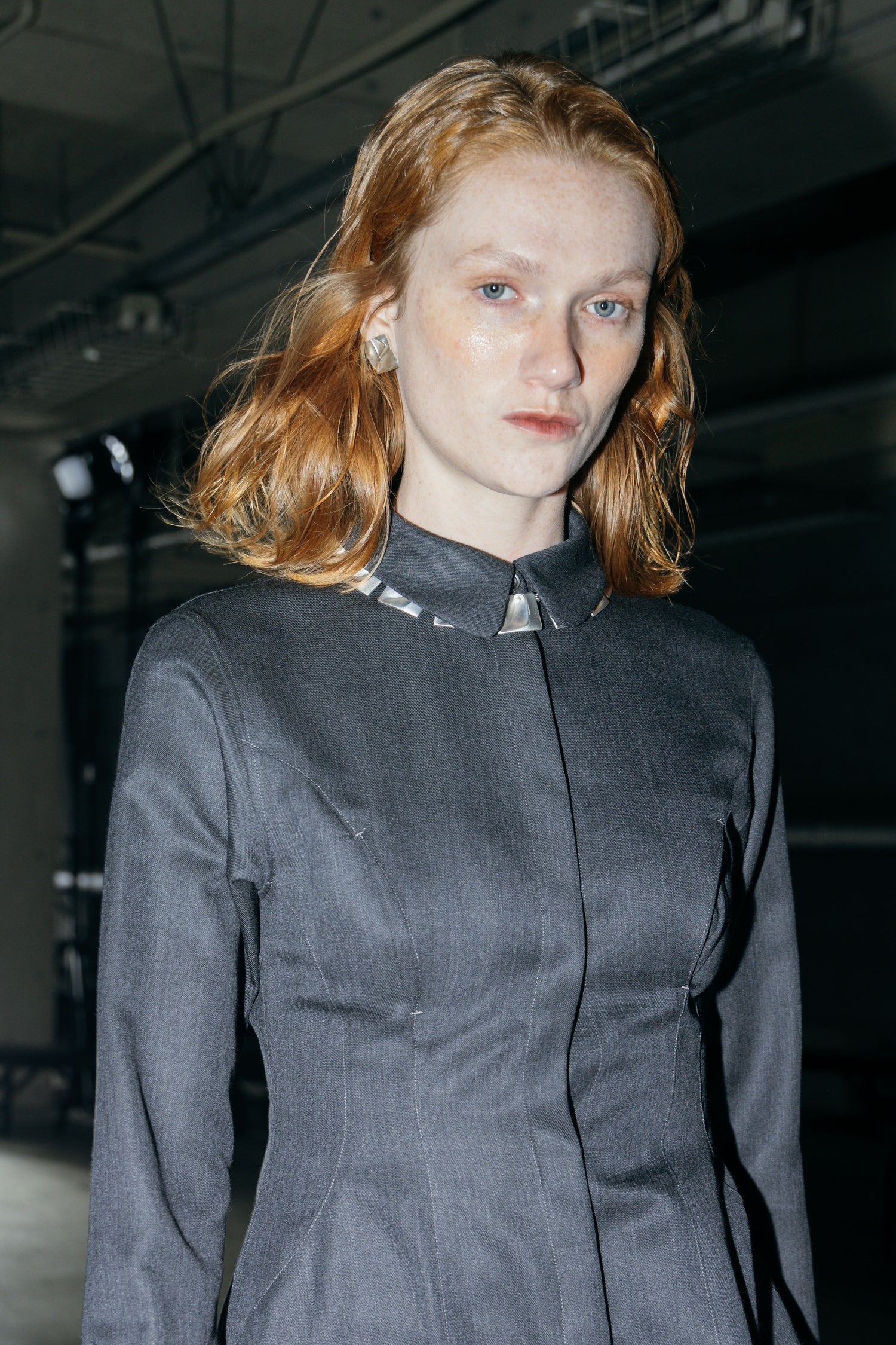 AKIKOAOKI's garments reconstruct the shape of the female body and reveal a silhouette only when the wearer actually wears the clothes, and Kalevala's jewelry feature innovative designs that symbolize the inner strength that women possess. Wearing each other's pieces, this complementary collaboration brings together each other's architectural shapes with the strength of women.