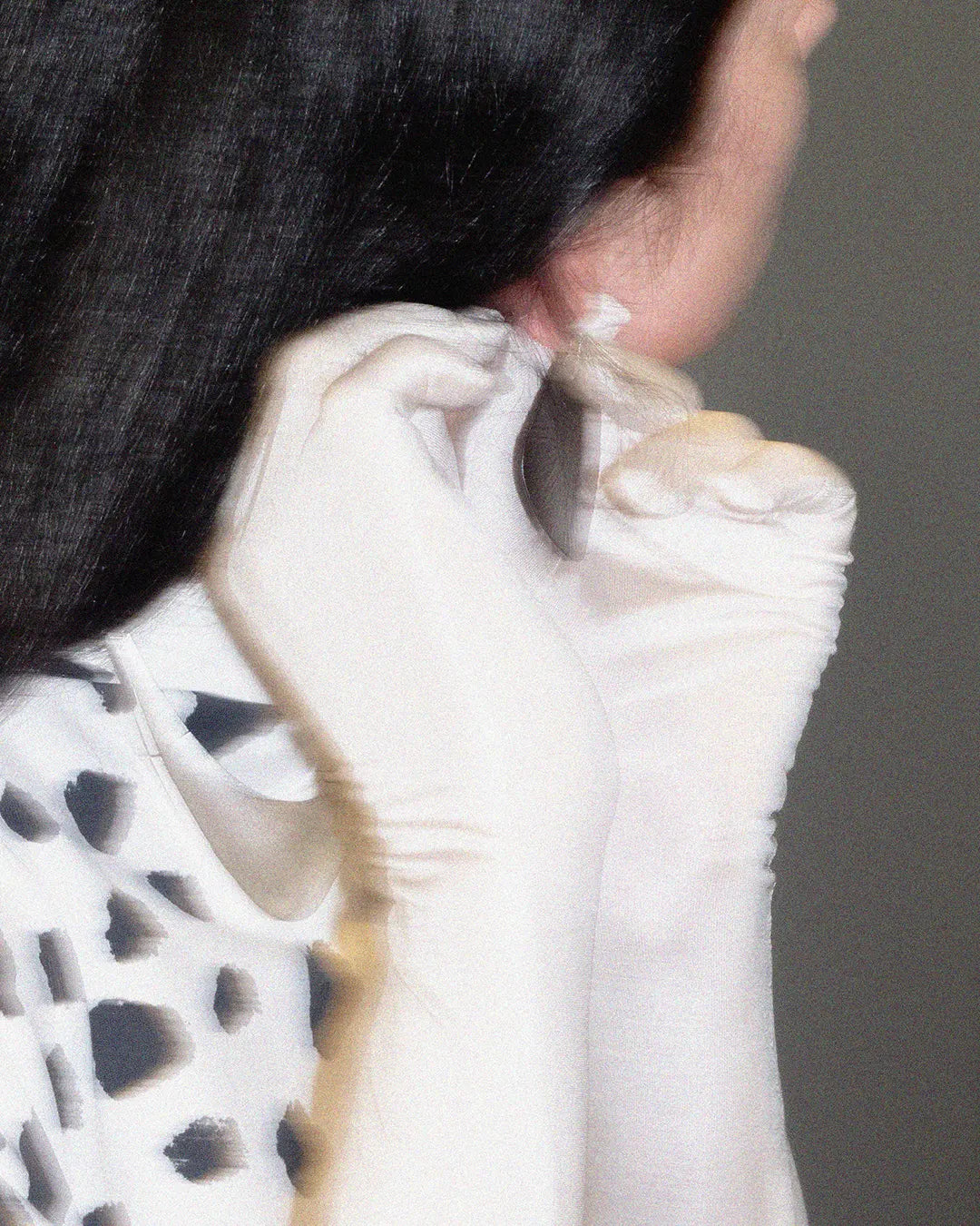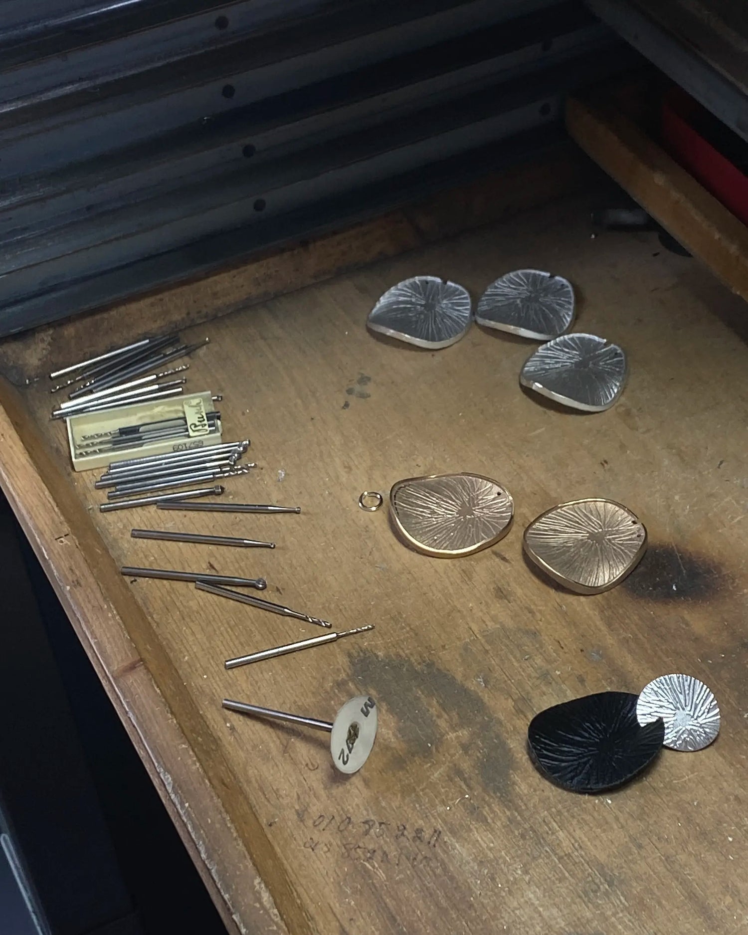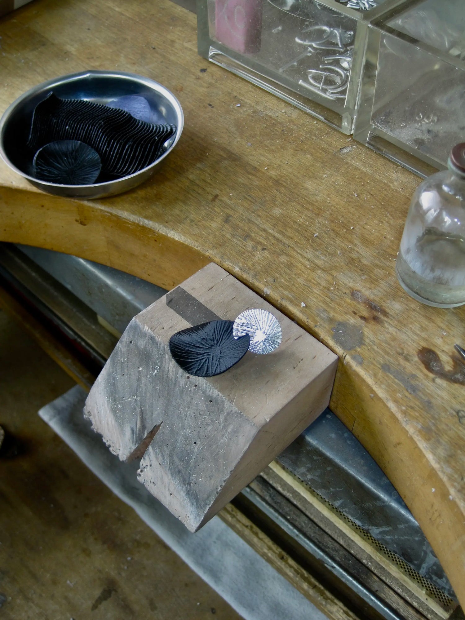”Nolla-korusarjan inspiraationa on Suomen uhanalaiset kukat, joiden joukosta löysin lehtoängelmän. Pidin kukinnon linjoista ja päällekkäisyydestä. Ajattelen samalla luonnon muutosta: Kuinka paljon häviää, ja mitä tulee tilalle? Näkyykö hävinnyt näissä tilalle tulleissa? Oli luontevaa ja innostavaa kokeilla juuri tässä korusarjassa uutta biomateriaalia”, Harmaala Chaloff kertoo.