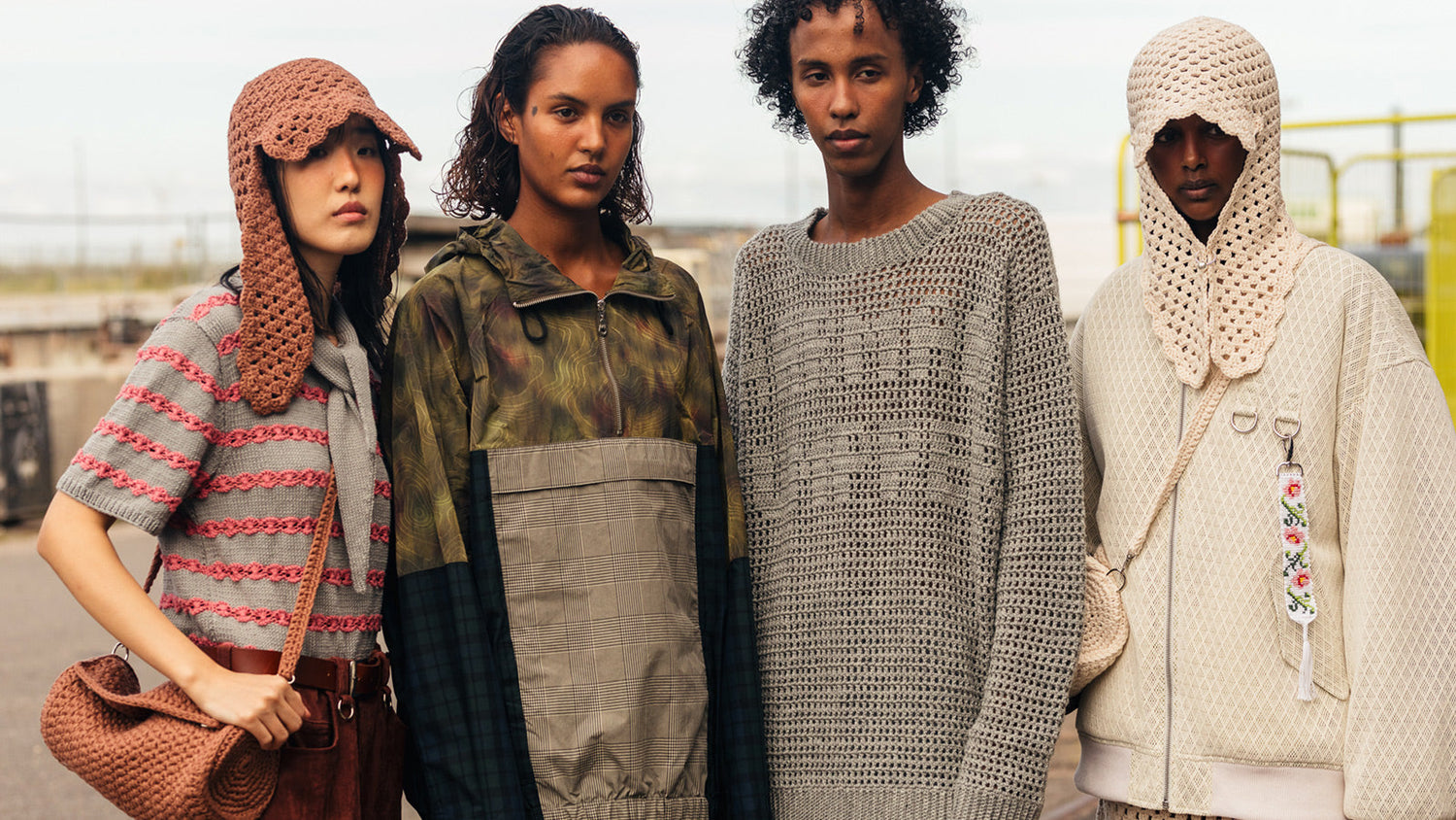 Mallilla on luonnoinvalkoinen takki sekä virkattu mekko, olkalaukku ja huppu, johon on kiinnitetty RAKAS Rolf Ekroth x Kalevala -koru.