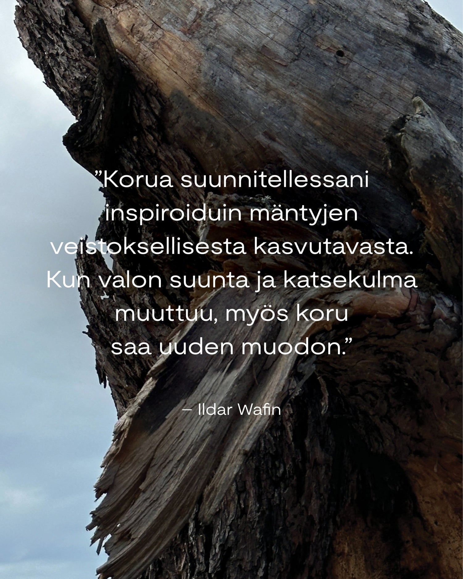 Männyt-korusarjassa yhdistyy suomalaisen luonnon mystiikka ja moderni, innovatiivinen muotoilu. Vanhoista saaristomännyistä ja niiden karusta kauneudesta inspiroituneen malliston on suunnitellut nuori muotoilija Ildar Wafin, joka valittiin Finnish Fashion Awards -voittajaksi New Talent -kategoriassa keväällä 2024.