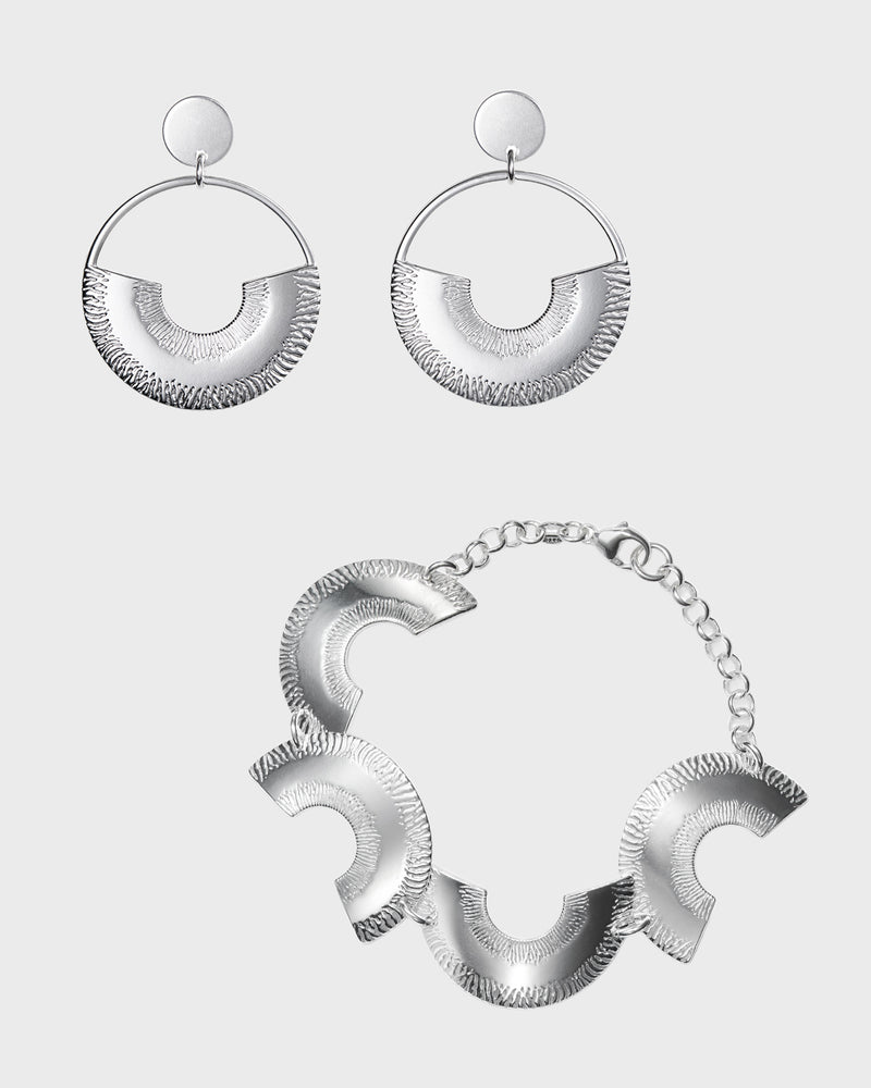 Kirkkaasta hopeasta valmistettu, näyttävä mutta kevyt rannekoru ja kauniit hopeiset korvakorut muodostavat nyt yhtenäisen setin.