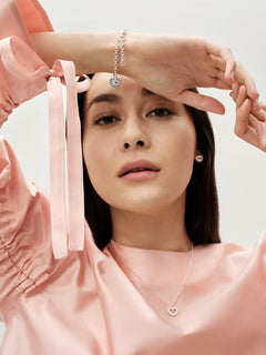 Roosa nauha 2025 -korut, hopeinen Valoisa-sydänriipus, -rannekoru ja -korvakorut, ovat saatavissa rajoitetun ajan. Korut valmistetaan käsityönä täysin kierrätetystä hopeasta Kalevala Korun omalla tehtaalla Helsingissä.