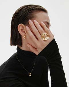 Valo ja varjo leikittelevät kullanhohtoisesta pronssista valmistettujen korvakorujen pehmeästi aaltoilevilla pinnoilla. Tappikiinnitys, tappi ja taustanasta hopeaa. Korvakorut ovat toistensa peilikuvat. Saatavissa myös hopeisina.