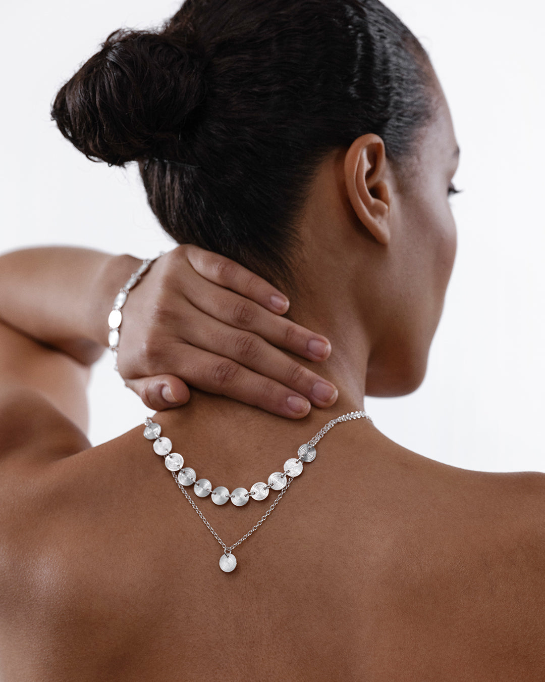 Many factors affect how a necklace fits around the neck: the height of the person, the thickness of the neck, the shape of the shoulders, clavicles, bust. The length of many of our necklaces can be adjusted, and separate extension pieces are also available for necklaces and pendants.