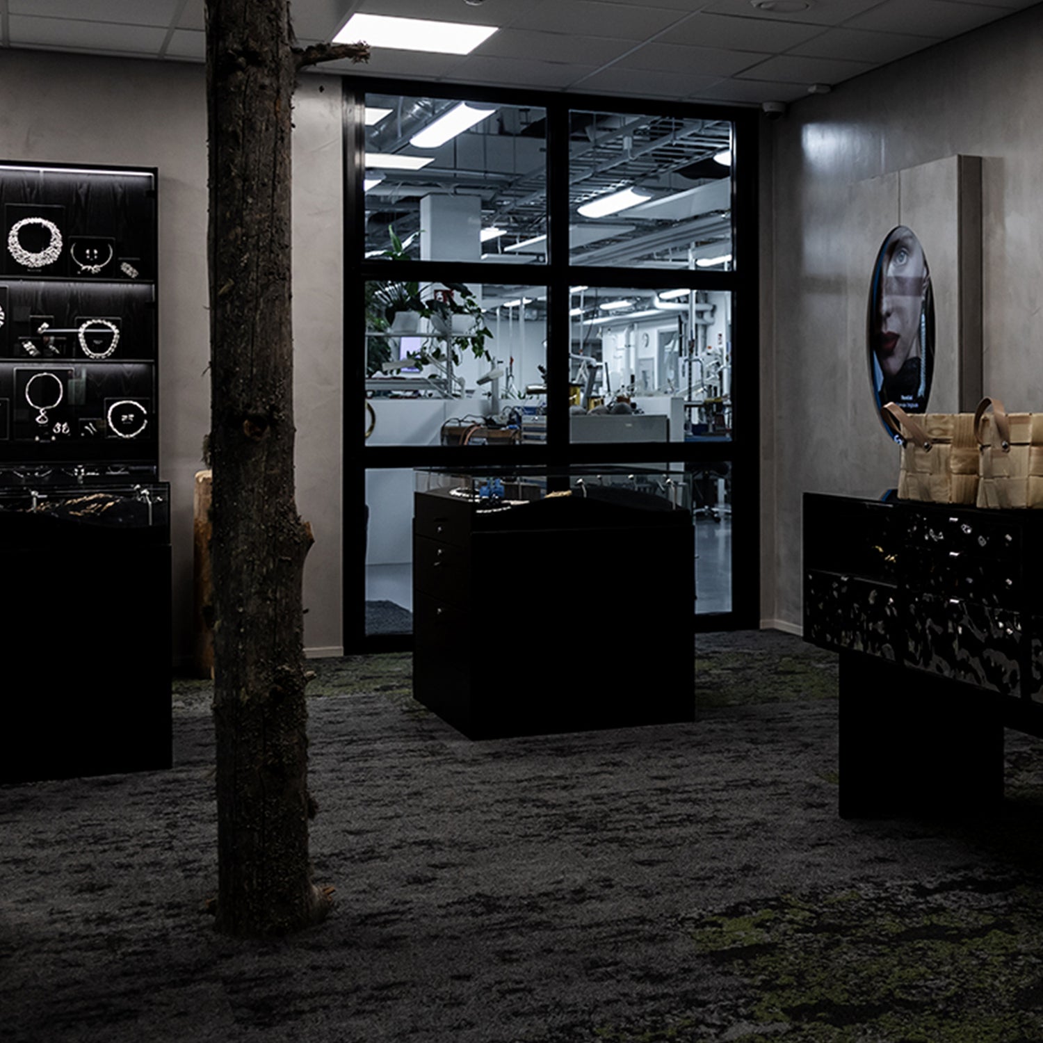 An Alluring jewelry artwork adorns the store's façade, while inside, changing art experiences support the display of jewelry.