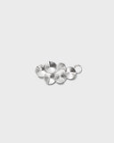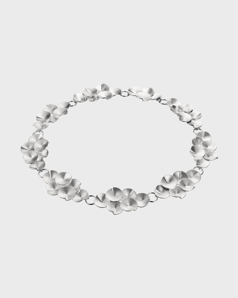 The abundance of form and material, the elegant glow of matte silver. The impressive, sculptural Echoes necklace consists of clusters of conical silver elements, connected with large silver rings. Wearing this necklace you are bound to get noticed! You can shorten the necklace by clasping it to the penultimate ring, making the last silver piece a pendant. There is also an extension piece available that you can lengthen the necklace with or wear as a pendant, either on a chain of your choice or as a complement to the Echoes necklace by attaching it to any of the large silver rings.