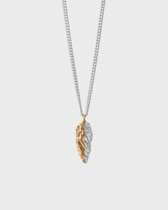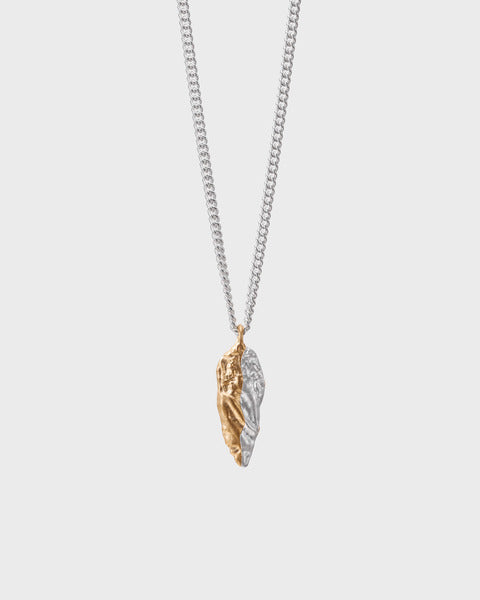 The seed-shaped Itu pendant is crafted from two interlocking silver elements, one of which is gold-plated. The pendant is intricately detailed on both sides. Curb chain, adjustable length 50/55/60 cm. Lobster clasp. Both the pendant (charm) and the chain can be purchased separately, too.