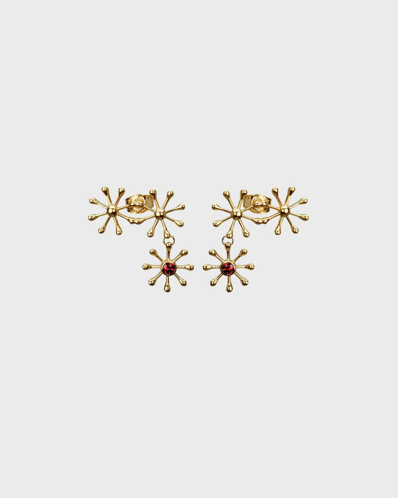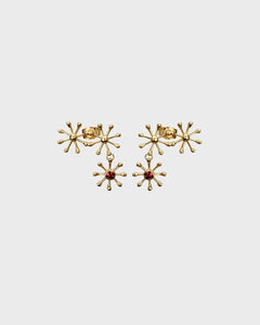 The magnificent Polaris series designed by Kirsti Doukas celebrated Kalevala Jewelry's 70th anniversary in 2007. The earrings made of 18K gold are adorned with garnets from Lapland. The warm glow of gold and the red glimmer of the garnets are reminiscent of the light and beauty of the short summers in Lapland. Stud earrings, mirror images of each other. Diameter of one star 13 mm.