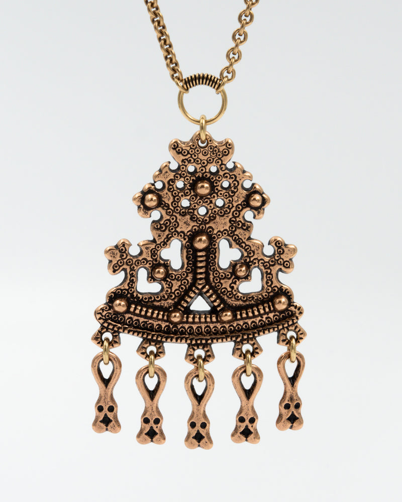 In the Viking Age, Finland became a crossroads where influences from East, West, and South blended, inspiring Finnish smiths to craft distinctive designs unlike any of their models. A bronze item found in Karkku — which served as the model for this impressive pendant — borrowed its Thor’s hammer motif from western neighbors. The tinkling pendants, in turn, were characteristic of the jewelry of Finno-Ugric peoples in the East. The bull’s-eye decorations and protruding knobs rising from the surface of the piece are, however, typical features of jewelry crafted in Finland during the Viking Age. The Karkku pendant was part of the Kalevala jewelry range from the late 1930s till the early 2000s. Width 54 mm, the reverse side is unpatterned. Anchor chain 70 cm, no clasp.